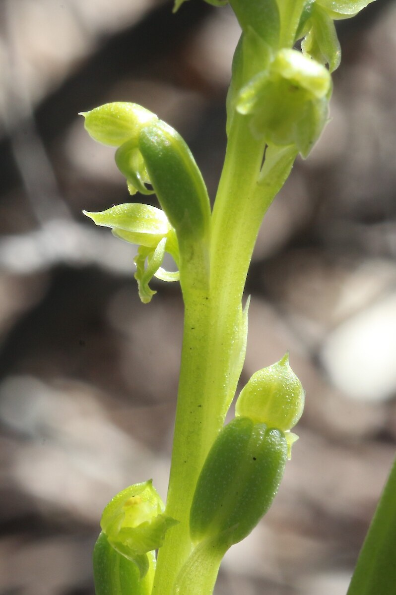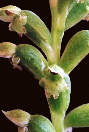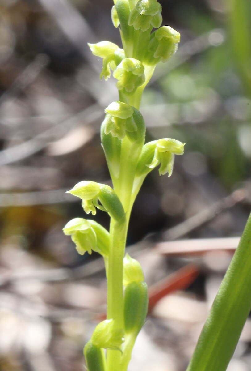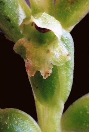 3-5 mm long, labellum deeply notched at its tip, with a back-facing point between the lobes; dorsal sepal with a tiny upturned tip. Ovary characteristically hump-backed.
